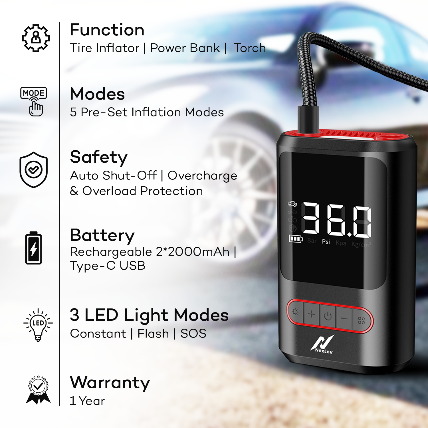 · Digital Display and Auto Shut off: These features prevent overinflation and ensure ease of use. It gives you peace of mind as you will know when the tyre is inflated.